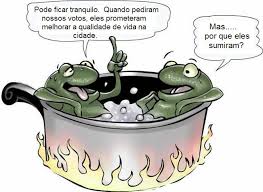 Eu, você e mais 200 milhões de brasileiros somos parte daquela experiência do sapo na panela no fogão aceso. A historinha – que não sei se é verdadeira, mas que parece ser – conta que, se jogado na água fervente, um sapo daria um pulo heroico para fora da panela, não antes de ser “selado” pelo líquido a 100 graus. O salto para fora da água, entretanto, a despeito de algumas queimaduras, manteria o sapo vivo e bem mais esperto. Se, ao contrário, o sapo fosse jogado na água fria e esta fosse aquecida lentamente, o sapo não se aperceberia do aumento gradual da temperatura e morreria cozido em fogo lento. Nós somos esses últimos sapos aí.